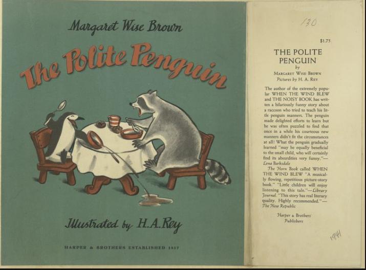 A raccoon tries to teach his little penguin manners, only to find that the penguin’s courteous new manners don’t always fit the circumstances. 1st Ed Pictures c/o JeNeal’s collection – Thanks